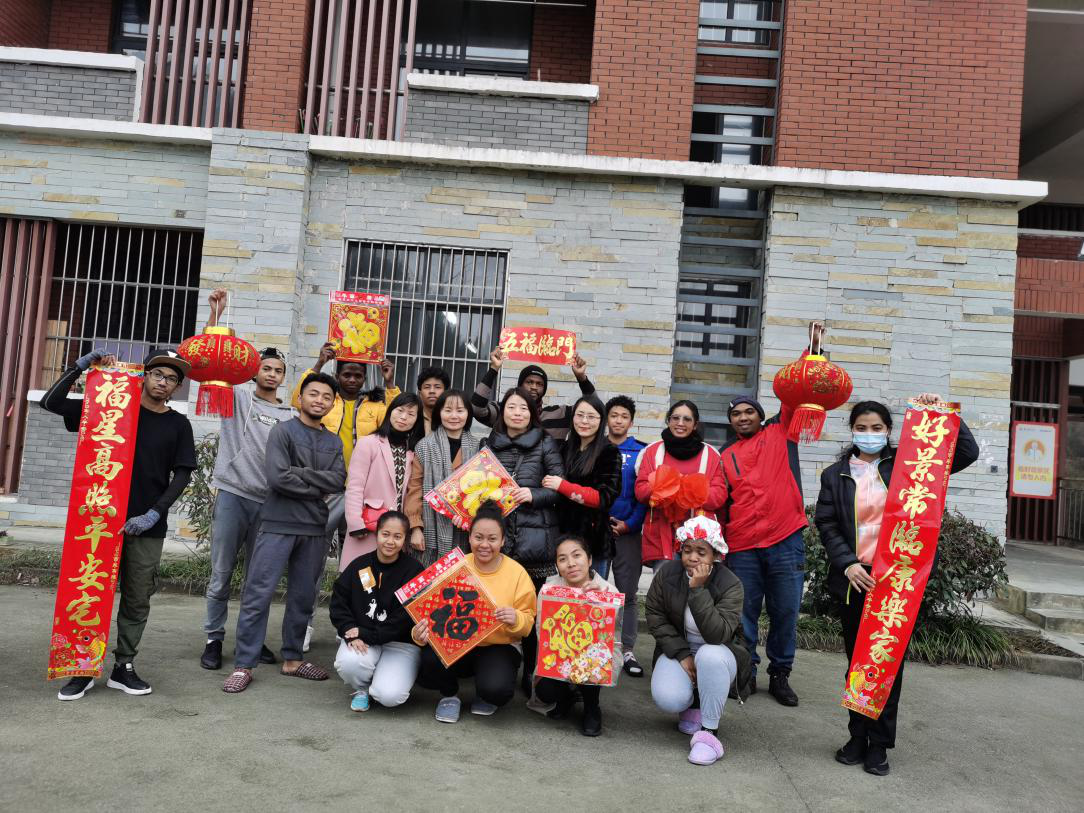 学院领导为留学生们送去了水果、糖等生活用品,同时还一起贴对联和福字、挂灯笼,共同感知中华传统文化。