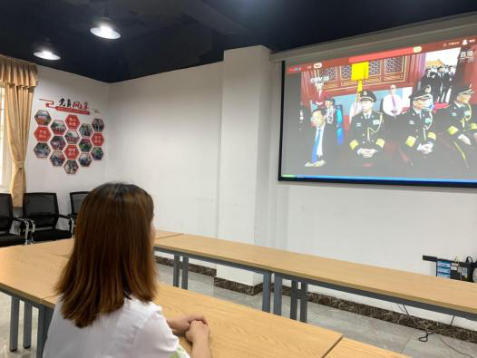 (学院全体行政人员在会议室集中观看)