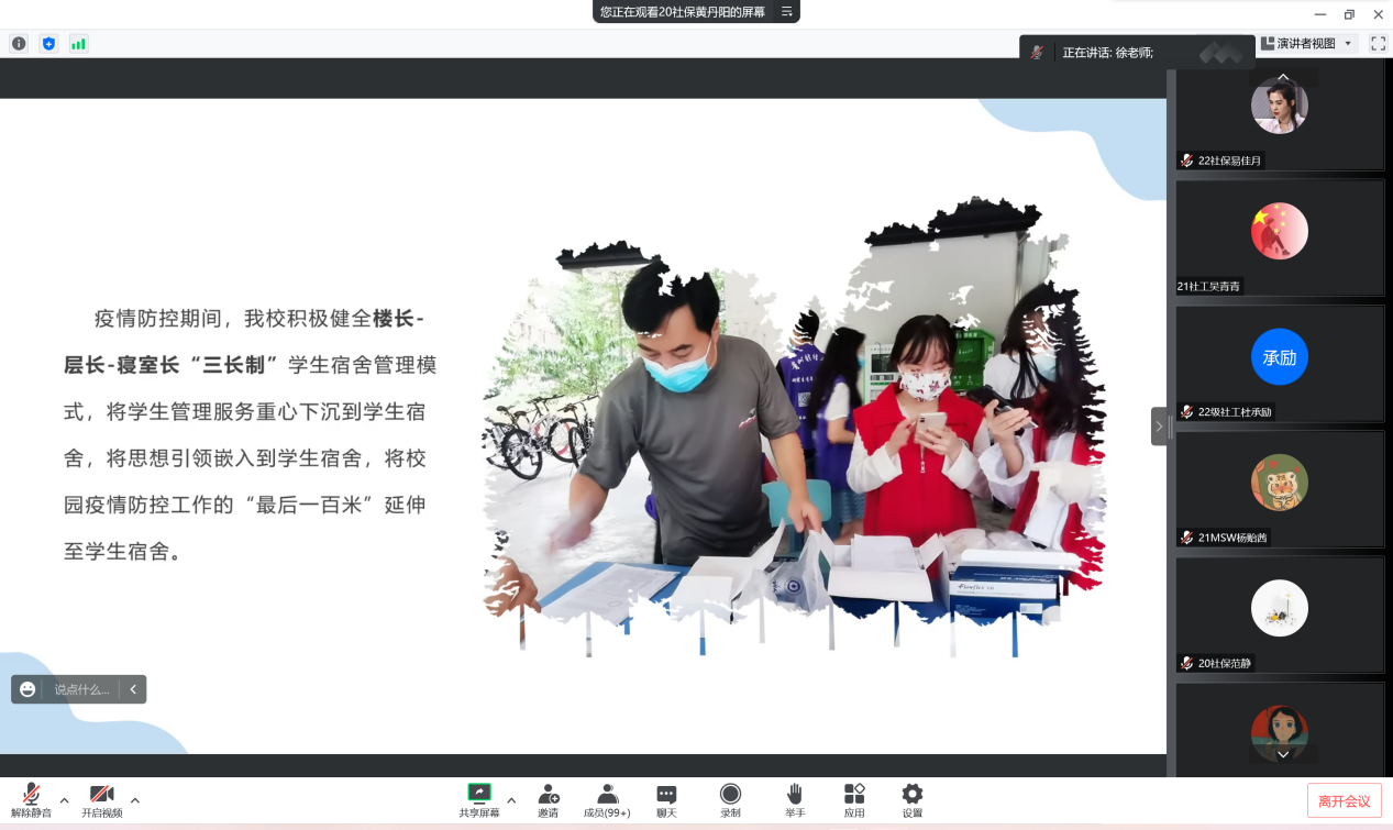 为充分发挥党支部战斗堡垒作用,鼓励号召广大党员力所能及地抗击疫情,百合小说 党委牵头组织开展了“同心战‘疫’ 我是防疫科普员”主题活动。9月23日,由研究生第二党支部进行第一期科普活动,为学院学生讲解我校目前的疫情防控措施和规定。活动以线上主题党日活动的方式进行,由研究生第二党支部书记徐欣主讲,20、21和22级社会保障、社会工作和社会医学及卫生事业管理全体学生参与。