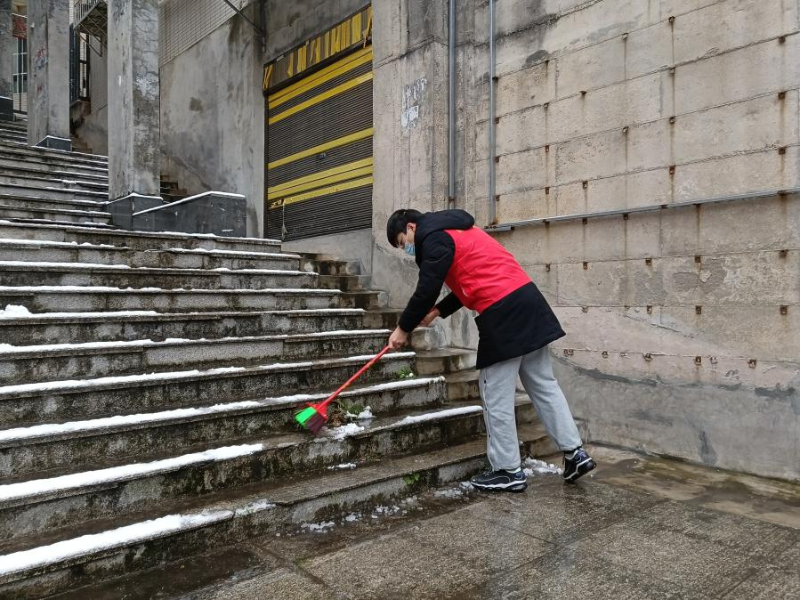 黄楠:瑞雪兆丰年,这几日,我的家乡连续下了几天的雪,道路上、屋顶上都堆满了积雪,四处白雪皑皑。下雪固然美好,可是下雪也会给居民们的正常生活带来一些困扰。道路上的积雪使得人们在上面行走时容易打滑、摔倒,堆积在高处的雪也会有压垮遮雨棚顶掉落的风险。雪后严寒,但是在此次活动中却充斥着温暖与阳光。我们不畏严寒,团结合作、齐心协力,虽然任务十分艰巨,但我们仍脸挂笑容,不怕困难,坚持把雪清理得干净。