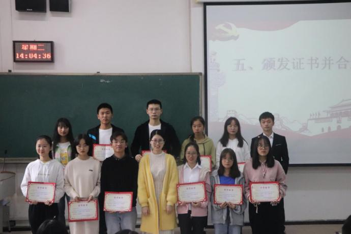 会议第三项,王倩倩、宋单琳老师为上一届党建中心学生干部办法颁发优秀干事、优秀部长证书。宋单琳表示,学生党建中心是党委的助手,也是学院党委同各学生党支部、班级的桥梁,希望大家精研业务,勤学本领,牢记使命,为了更好的为学院服务,为学院的党建工作献策献力,也相信新一届学生党建中心能够发展得更好。