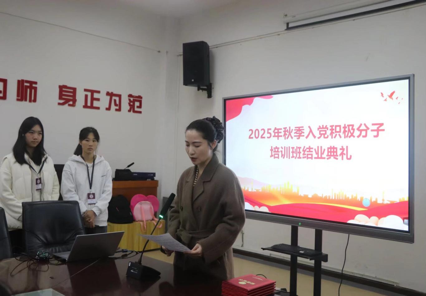 2025年秋季入党积极分子培训班的圆满落幕,不仅有效凝聚了学员力量、增强了集体向心力,为大家今后的学习与工作筑牢了坚实根基,更让学员们进一步坚定了理想信念、明晰了责任使命,为其以饱满热情和务实行动向党组织靠拢注入了强劲动力,为党组织储备优秀后备力量奠定了坚实基础。