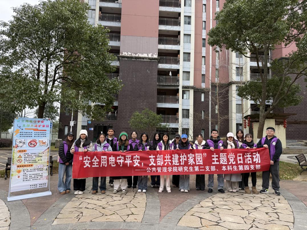 研究生第二党支部与本科生第四党支部聚焦冬季用电安全,走进学校公租房小区开展“安全用电守平安,支部共建护家园”主题党日活动。党员志愿者们在小区院坝发放宣传单,为居民们解答电器老化处理、大功率电器使用等安全知识问题;还分成小组入户宣传,将安全用电“五不”原则及触电急救知识送上门,切实提升居民用电安全意识。