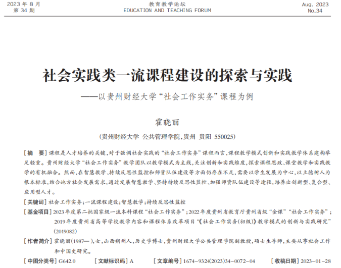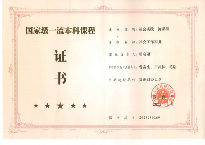 课程负责人霍晓丽:副教授,博士,硕导,中级社工师,社工督导。承担《高级社会工作实务》《社会工作实务》《社会工作实务专题》等教学任务,被聘请为惠水县好花红社会工作服务中心、贵阳春阳社会工作公益服务中心督导。