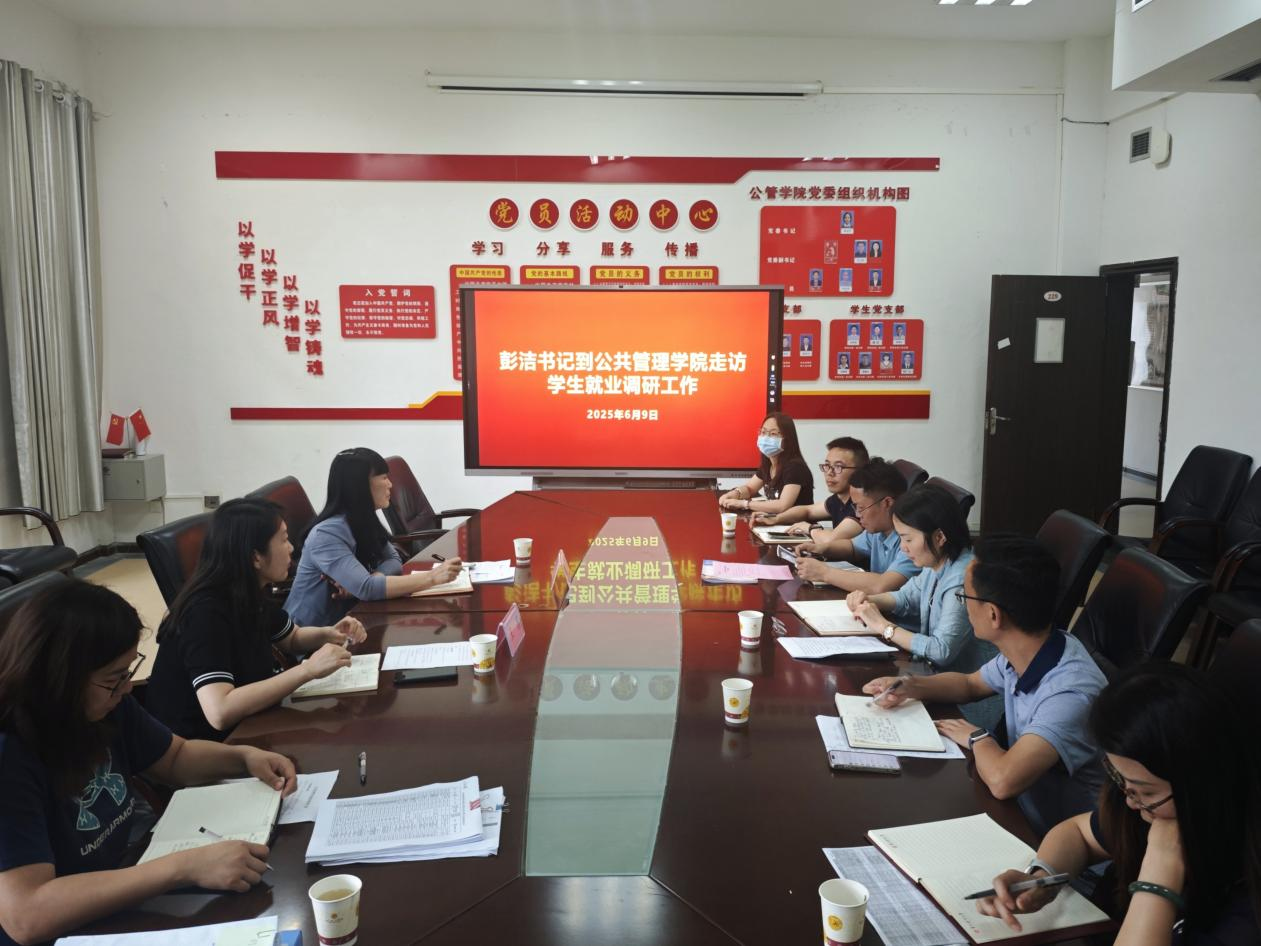本网讯:(周靖 图文报道)6月9日下午,校党委副书记彭洁赴百合小说 开展2025届毕业生就业工作进展专题调研,招生就业处副处长(主持工作)王茜、就业管理副科长王晨晓随同。百合小说 党委书记廖承红,副院长(主持工作)王武林,副书记杜吉松、张月娥,副院长杨睿,2025届毕业班辅导员及就业工作人员共同参加调研座谈。