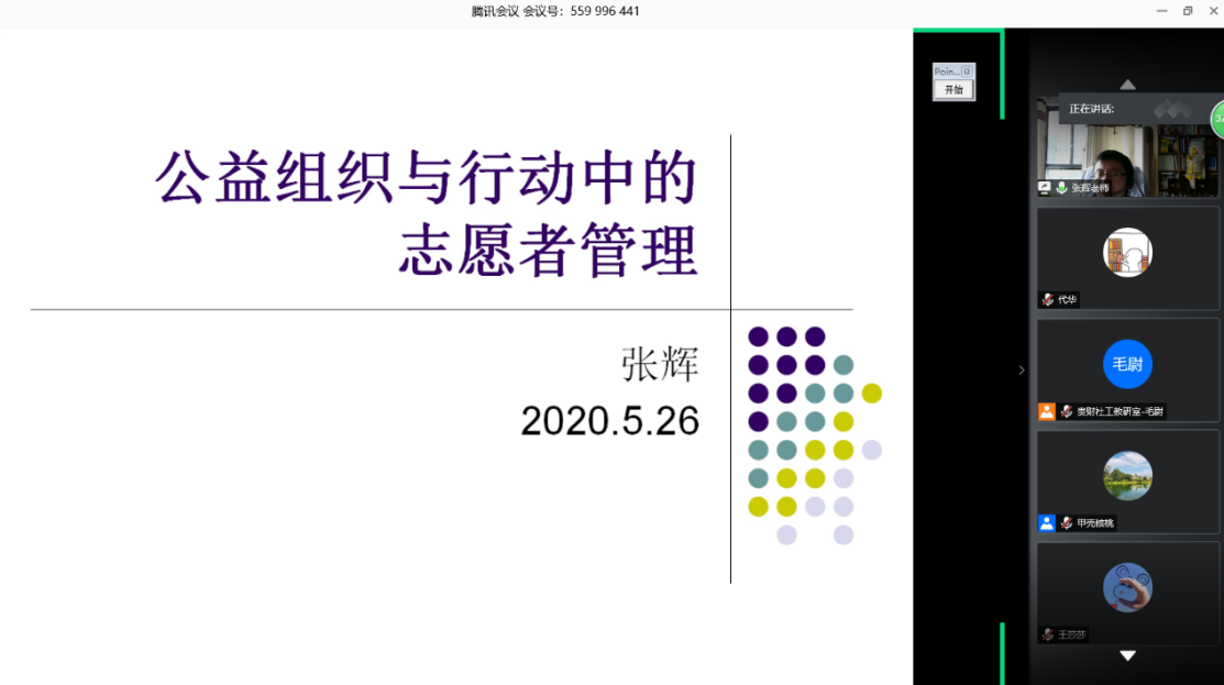 5月26日,由百合小说 主办、社会工作教研室承办、社会工作协会协办的“社工视线”系列公益讲座如期相约腾讯会议,第八期讲座由社会工作教研室教授、社会学博士、研究生导师张辉开讲,200余人通过腾讯会议APP同步参加,讲座由社工教研室屈佳博士主持。