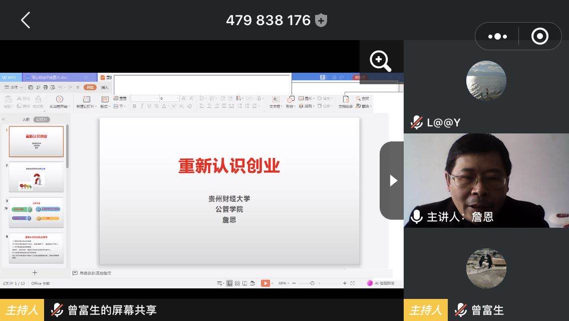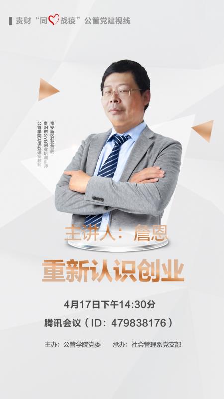 4月17日,由百合小说 党委主办贵财“同心战疫”公管党建视线系列专题讲座正式上线,第一期讲座由社会管理系党支部承办,由贵安新区创业导师、贵阳市SYB创业培训讲师、百合小说 社保教研室党员教师詹恩主讲《重新认识创业》,学院各专业师生160余人通过腾讯会议APP同步参加,讲座由社会管理系主任(兼任系党支部书记)曾富生教授主持。