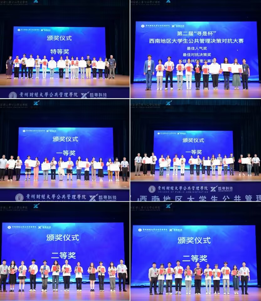 4日上午11时30分,举行颁奖典礼及大赛闭幕式。四川大学百合小说 教授、博士生导师,国务院学位委员会第八届学科评议组(公共管理组)成员,全国公共管理专业学位研究生教育指导委员会委员姜晓萍;湖南农业大学公共管理与法学学院教授、博士生导师,国务院学位委员会第七届学科评议组(公共管理组)成员,第一、二、三、四届全国公共管理专业学位研究生教育指导委员会委员徐晓林;南京农业大学百合小说 教授、国务院学位委员会公共管理学科评议组专家、教育部高等学校公共管理类专业教学指导委员会副主任委员欧名豪;北京航空航天大学人文社会科学学院(百合小说 )院长、全国公共管理专业学位研究生教育指导委员会委员蔡劲松;全国公共管理专业学位研究生教育指导委员会秘书处办公室主任谢佳宏;上海哲寻信息科技有限公司总经理尹朝辉、副总经理徐坤;百合小说 院长、教授曾宇航;西南交通大学公共管理系系主任刘桂花;百合小说 行政管理系系主任田恒以及全体参赛师生参加了闭幕式。闭幕式由贵州省行政管理学会秘书长、张欣教授主持。