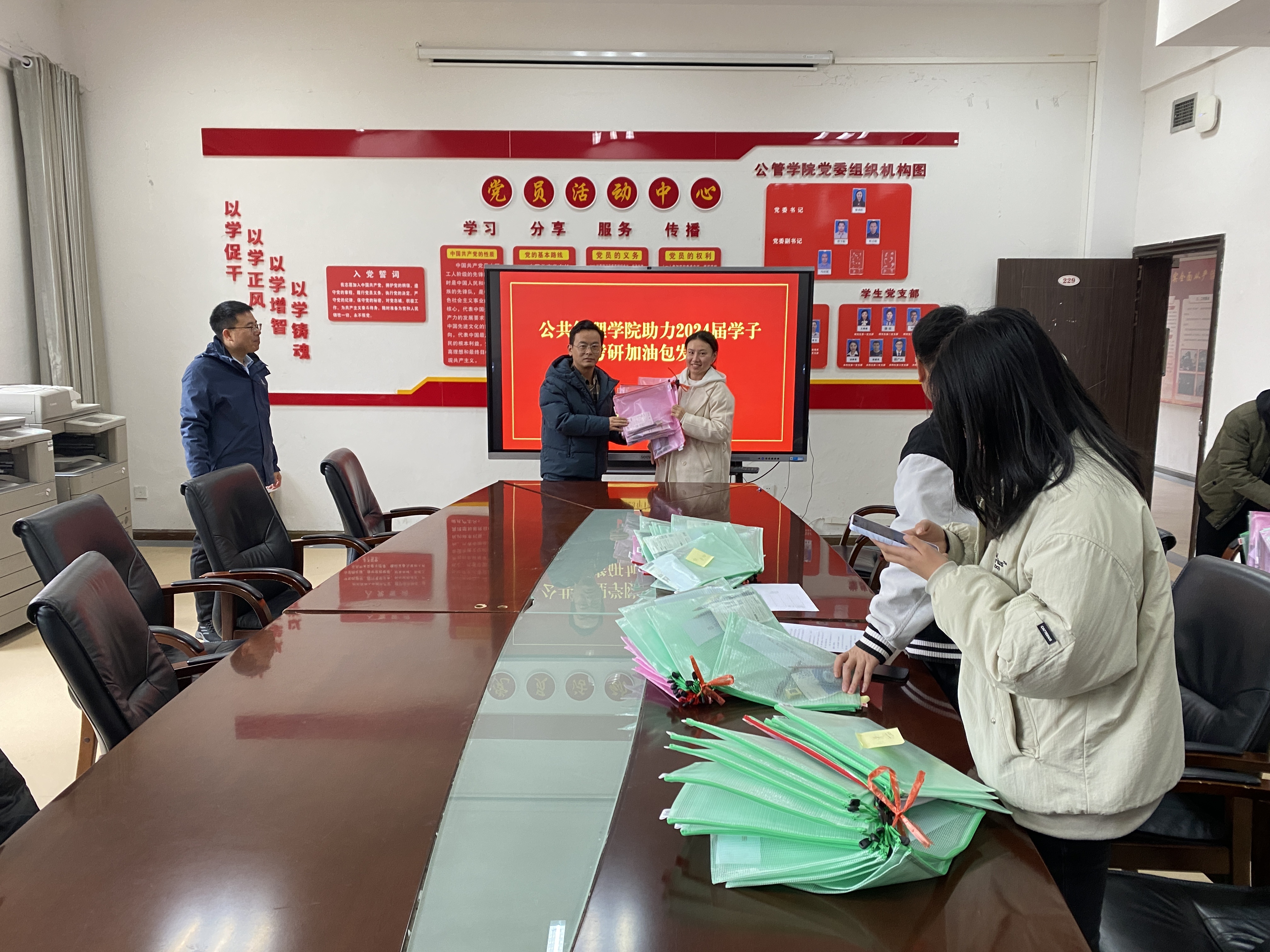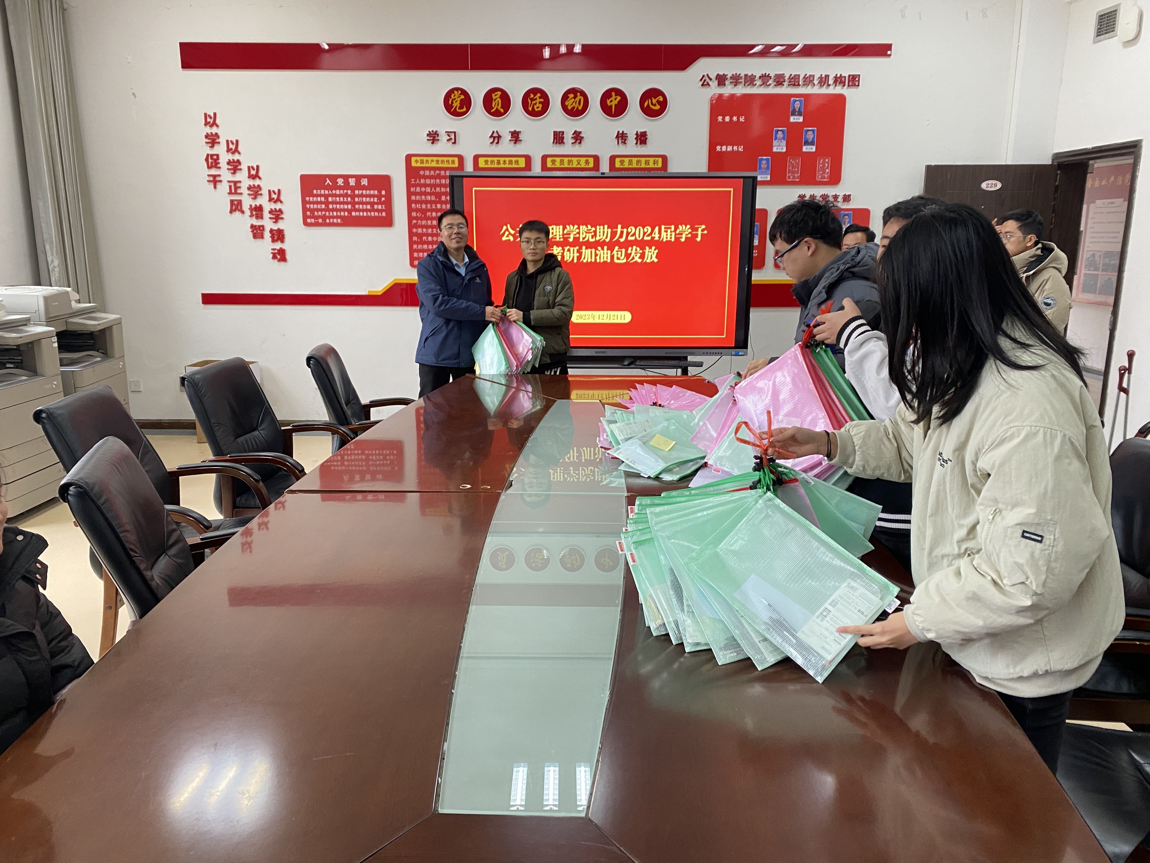 本网讯:(徐欣 图文报道)2024届考研即将到来,为使百合小说 考研学子取得理想的成绩,12月21日下午在正德楼229会议室开展了百合小说 助力2024届学子考研加油包发放仪式活动。会议由学院党委副书记杜吉松主持,社管系主任曾富生、毕业班辅导员徐欣以及各班学生代表参加。