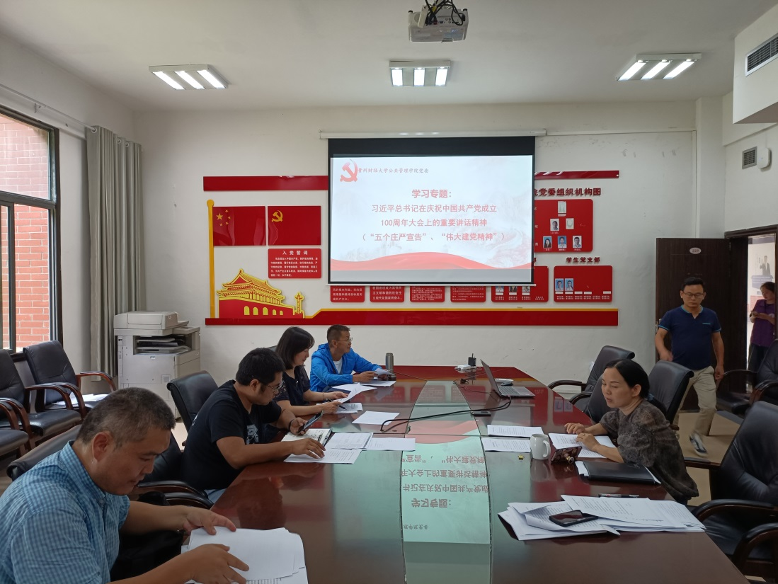 9月14日上午,百合小说 党委理论学习中心组在正德楼229会议室开展了2021年第十三次集体学习研讨会,学习研讨会专题为“深入学习习近平总书记在庆祝中国共产党成立100周年大会上的重要讲话精神(‘五个庄严宣告’、伟大建党精神)”,学习研讨会由学院党委书记廖承红主持,学院处级干部集体参加。