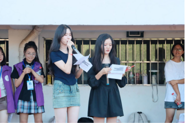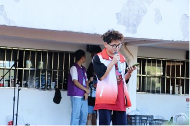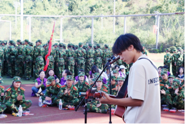 刚从村超凯旋归来的啦啦队为同学们表演了舞蹈《Believer》,郭坤同学表演吉他弹唱《形容》,学院青协杨德毅表演歌曲《一半》,学院融媒体中心吴芳铃表演歌曲《桥豆麻袋》,他们的精彩表演赢得了同学们的满堂喝彩,现场气氛热烈,笑声、掌声充满了训练场。