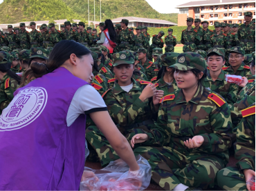 随后,学院领导及学生志愿者热心地将解暑的饮料、水果以及零食送到新生手中。