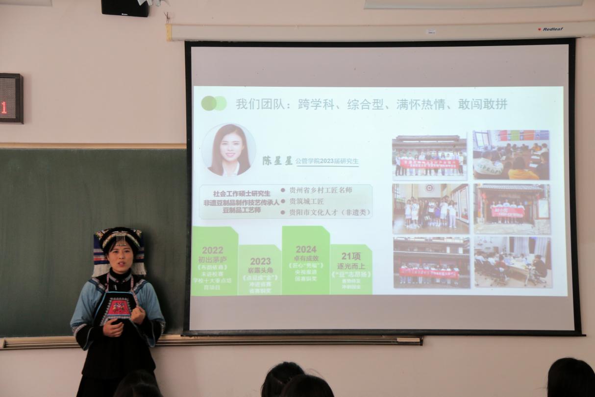 贵阳市级非遗豆制品制作技艺(灰豆腐)传承人、2023届社会工作专业硕士毕业生陈星星担任主讲人。 陈星星作为返乡创业的青年非遗传承人,不仅创立了“布衣星”品牌,搭建起标准化生产工坊与非遗体验空间,更凭借对灰豆腐技艺的坚守与创新斩获“筑城工匠”“省级乡村工匠名师”等多项荣誉,其事迹被央视《晚间新闻》专题报道,是青年传承非遗和创新创业的典范。