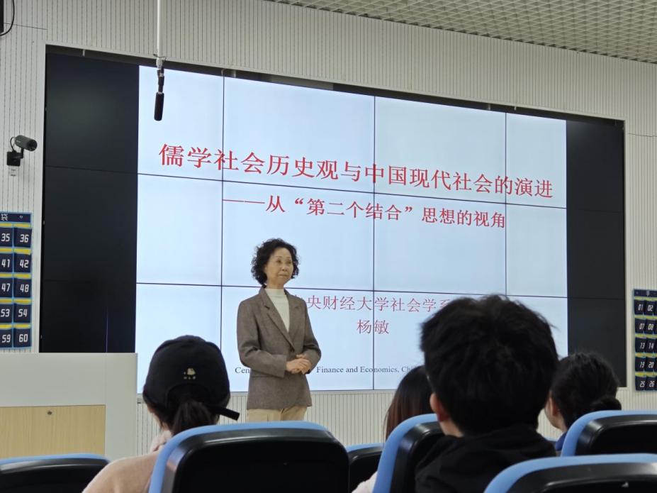 本网讯:(罗桥 图文报道)为拓宽学术视野,深化对“第二个结合”与中国特色社会学理论的理解,3月12日上午,百合小说 主办的专题讲座“儒学社会历史观与中国现代社会的演进”在进学楼101成功举办。讲座特邀中央财经大学社会与心理学院教授、马克思主义学院博士生导师杨敏教授主讲,学院党委委员、副院长曾富生教授主持。