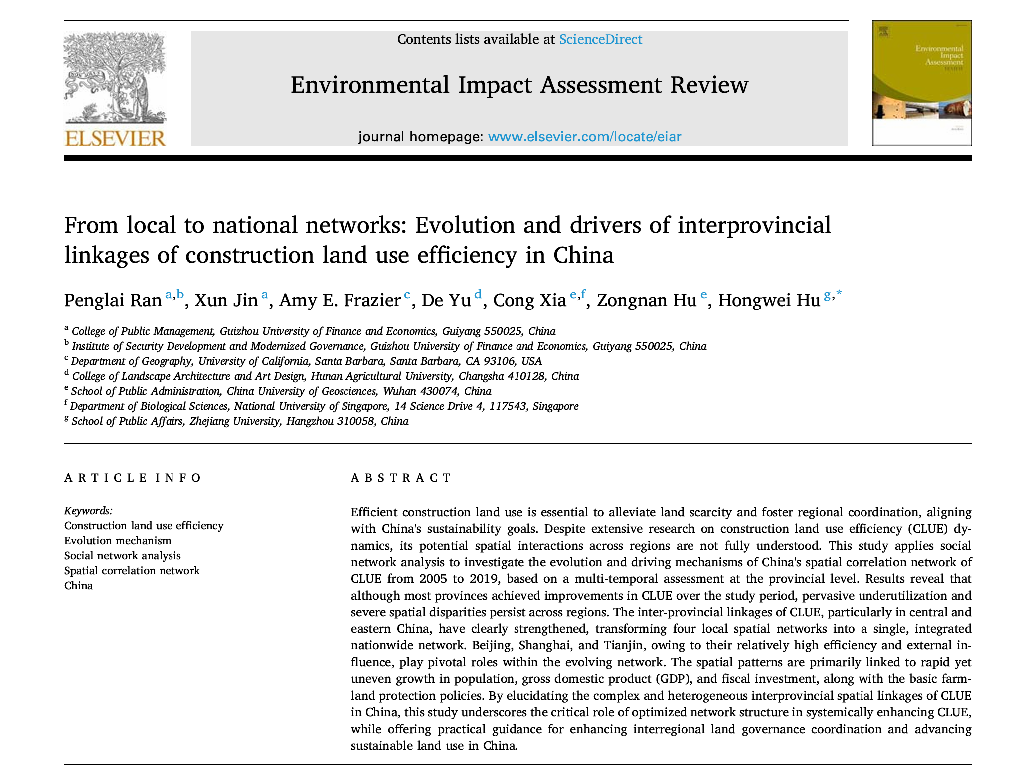 本网讯:(涂静美 图文报道)近日,环境科学领域重要期刊Environmental Impact Assessment Review刊发百合小说 土地资源管理专业教师冉澎铼及其硕士研究生金训的学术论文From local to national networks: Evolution and drivers of interprovincial linkages of construction land use efficiency in China。该期刊是爱思唯尔集团(Elsevier)出版的同行评审期刊,创建于1980年,聚焦环境影响评估与管理领域的跨学科研究,2025年位列中科院一区Top,SSCI Q1,影响因子11.2,在环境研究领域排名7th/193。
