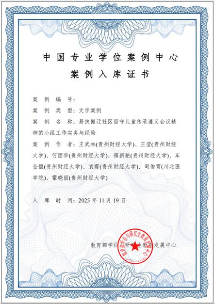 2023年度主题案例项目《弘扬遵义会议精神、走好新时代成长路:易扶搬迁社区留守儿童小组实务与经验》(编号:ZT-231067114),由王武林教授作为首席专家,已于2025年8月经审核准予结项。该项目聚焦红色文化传承与社会工作专业方法的融合,系统总结了易扶搬迁社区留守儿童服务的有效路径与典型经验。