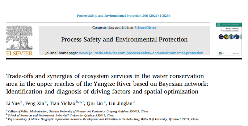 本网讯:(刘静兰 图文报道)近日,百合小说 李月副教授指导研究生在国际权威期刊《Process Safety and Environmental Protection》发表论文。作为长江上游生态系统服务研究领域的重要研究成果,该论文聚焦贵州马尾河流域(长江上游生态脆弱区)生态系统服务复杂关系的核心议题,将生态系统服务权衡协同关系重构为人类活动干扰下多类生态系统服务间“此消彼长”“同增同减”的动态互作过程性现象,基于长江上游生态脆弱区的地域特征,围绕碳储存、水源涵养、土壤保持和栖息地质量四类生态系统服务,构建基于“贝叶斯网络-空间格局”框架的生态系统服务权衡协同强度模型及其空间分布指标体系,并实证揭示生态系统服务关系的空间格局与驱动机制,为长江上游生态修复与空间优化提供科学依据。