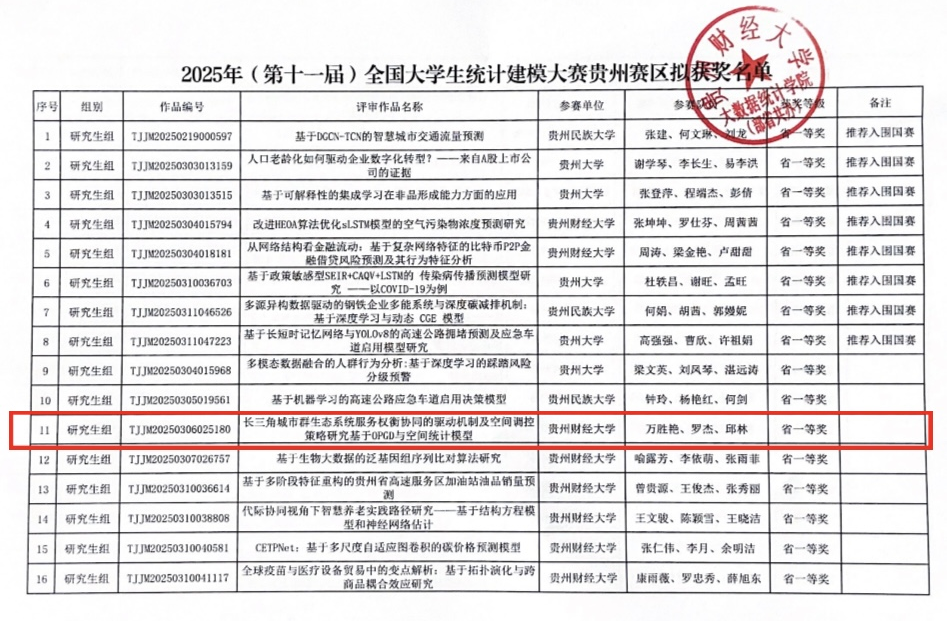 本网讯:(万胜艳 图文报道)2025年5月24日,2025年(第十一届)全国大学生统计建模大赛贵州赛区在百合小说 举办,由百合小说 土地资源管理专业李月副教授指导的2024级研究生万胜艳、罗杰以及2023级研究生邱林所组成的团队,凭借《长三角城市群生态系统服务权衡协同的驱动机制及空间调控策略研究—基于OPGD与空间统计模型》的研究成果,荣获省级一等奖。