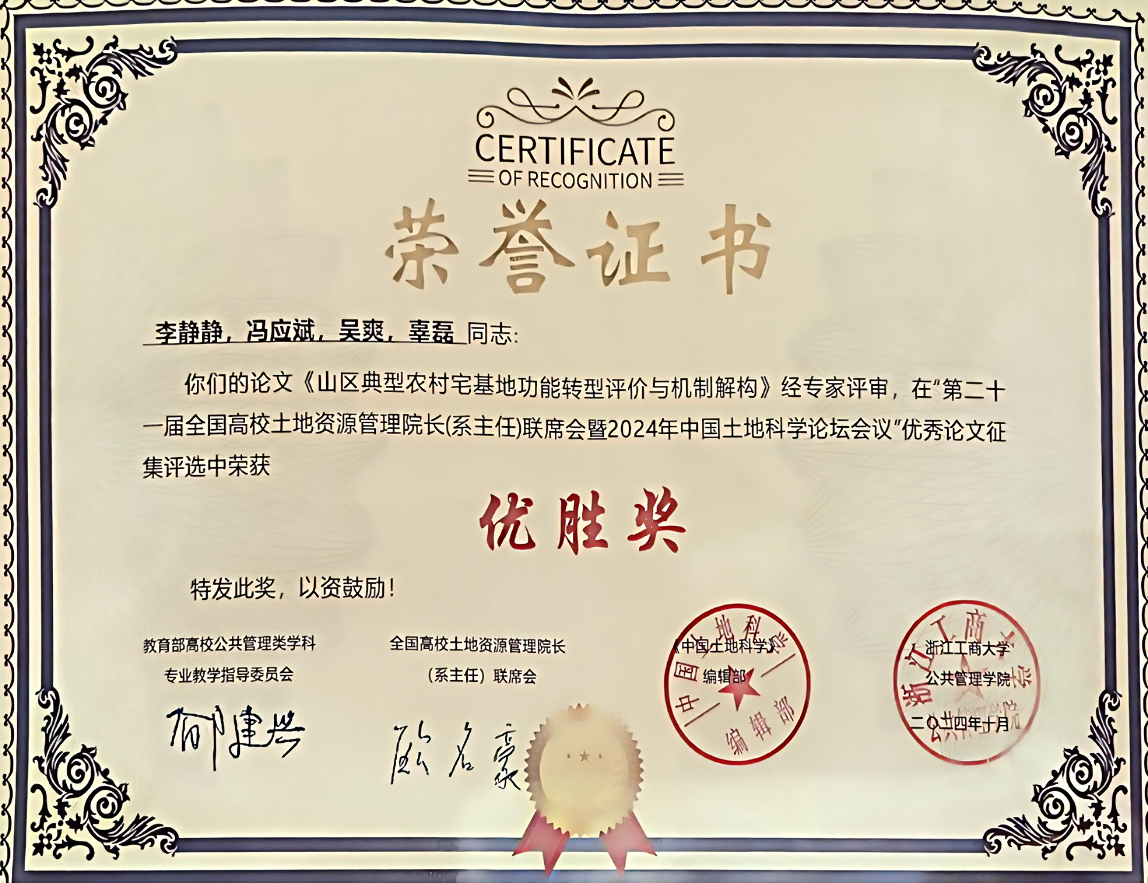 “第二十一届全国高校土地资源管理院长(系主任)联席会暨2024年中国土地科学论坛会议“优秀论文
