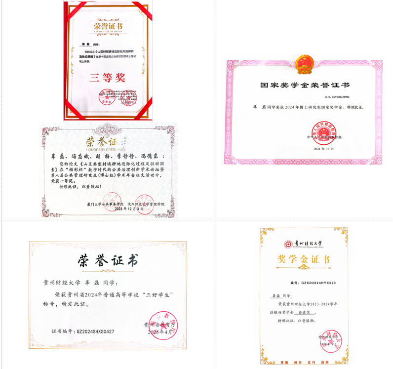[1]贵州省研究生科研基金“城乡融合背景下山区乡村地域多功能与土地利用转型耦合研究”(2024YJSKYJJ238),2024.12-2025.12,主持,在研.